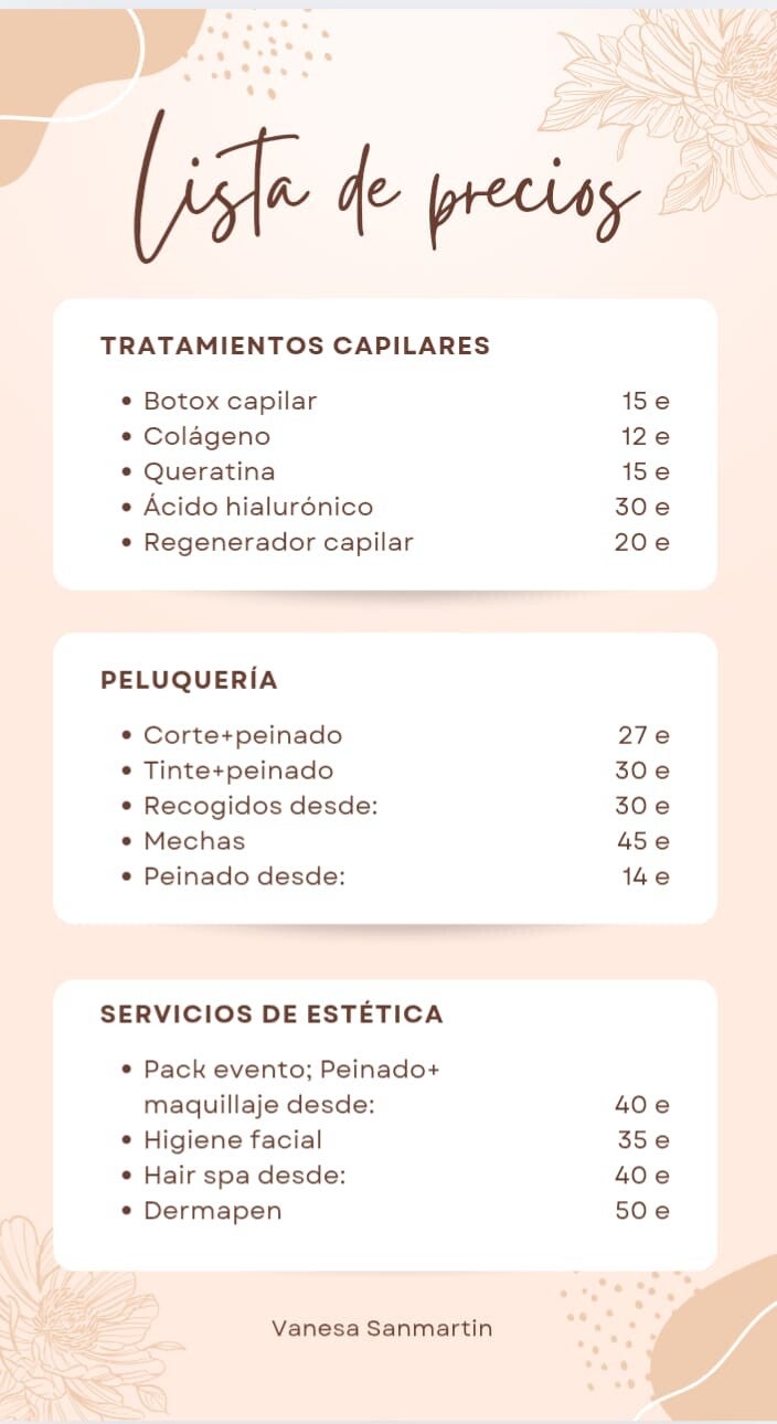 Ofrecemos una amplia gama de servicios de estética para cuidar tu piel y resaltar tu belleza. Disponemos de tratamientos faciales y corporales , en Vanesasanmartinhairspa encontrarás todo lo que necesitas para sentirte radiante. Utilizamos productos de alta calidad y técnicas innovadoras para garantizar resultados excepcionales.